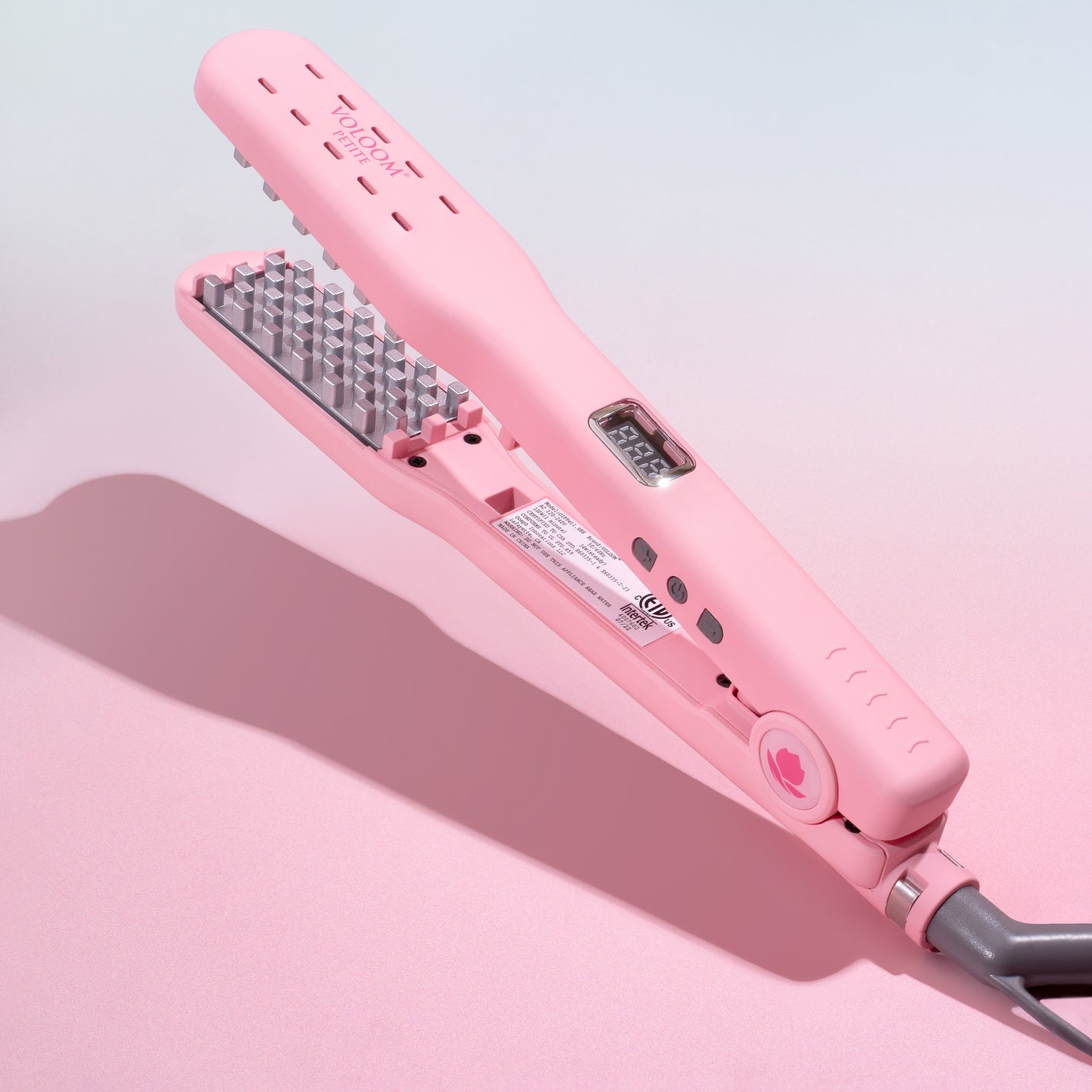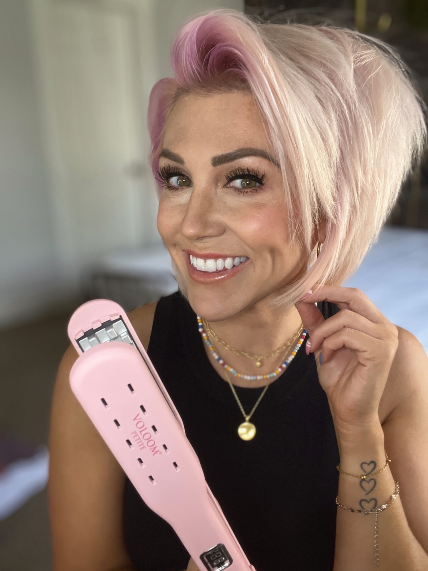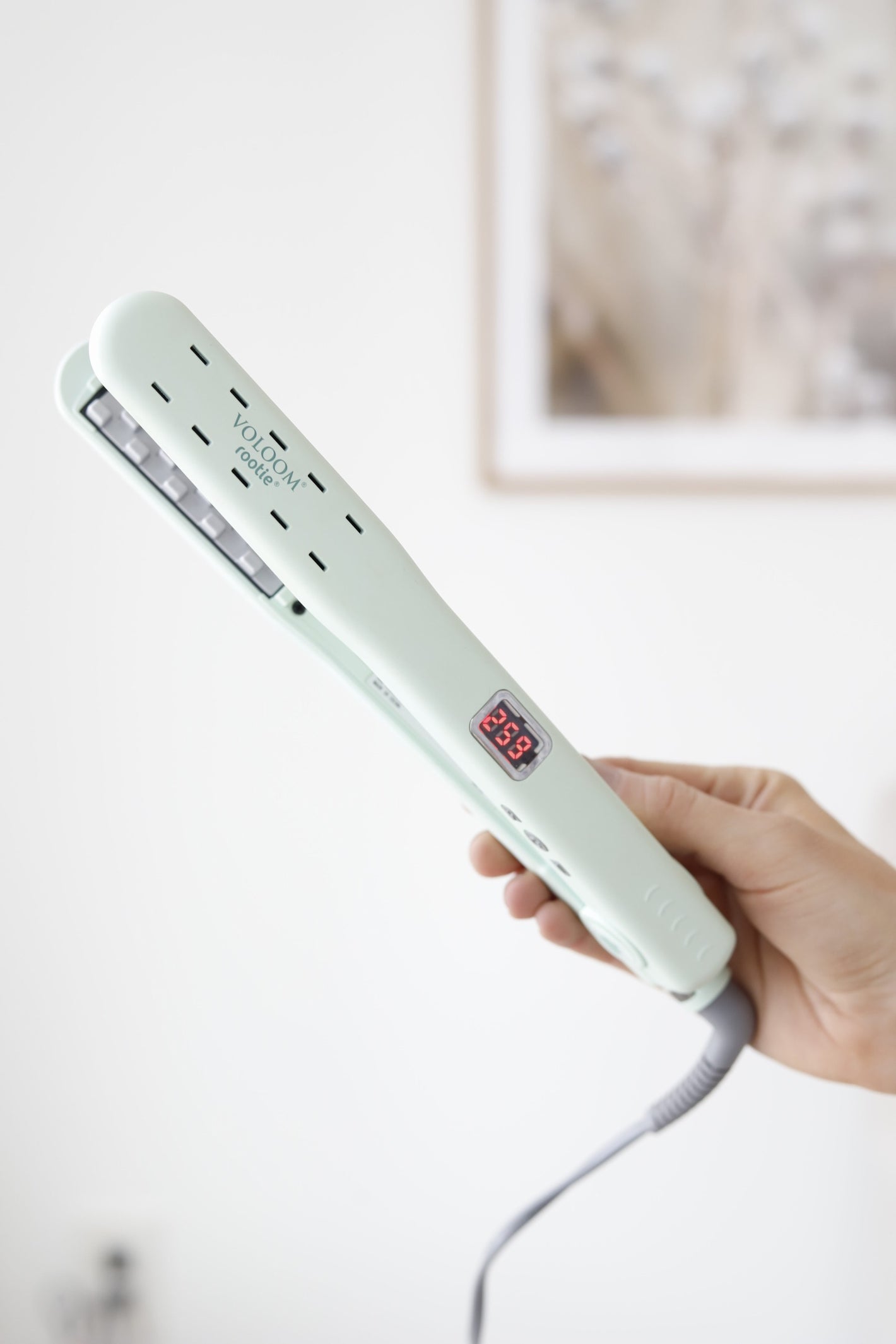 If you just want crown volume or if you want even more volume on your crown, try this: Make a section of hair a couple of inches wide at the top of your head where you want more height. If you have a middle part, take an inch-wide section along both sides of your part and make a single section of hair. Hold this section of hair straight up from the top of your head. Using a lower temperature than normal (20 -30 degrees below what you would usually use), use VOLOOM on this section close to the scalp, but do not clamp the plates together completely. Hold in this position for a second or two. Unclamp. The inner- most part of the section in the middle of your head will have height, but little or no texture. If you want even more height, you might try using a heat protection or styling spray on this section.