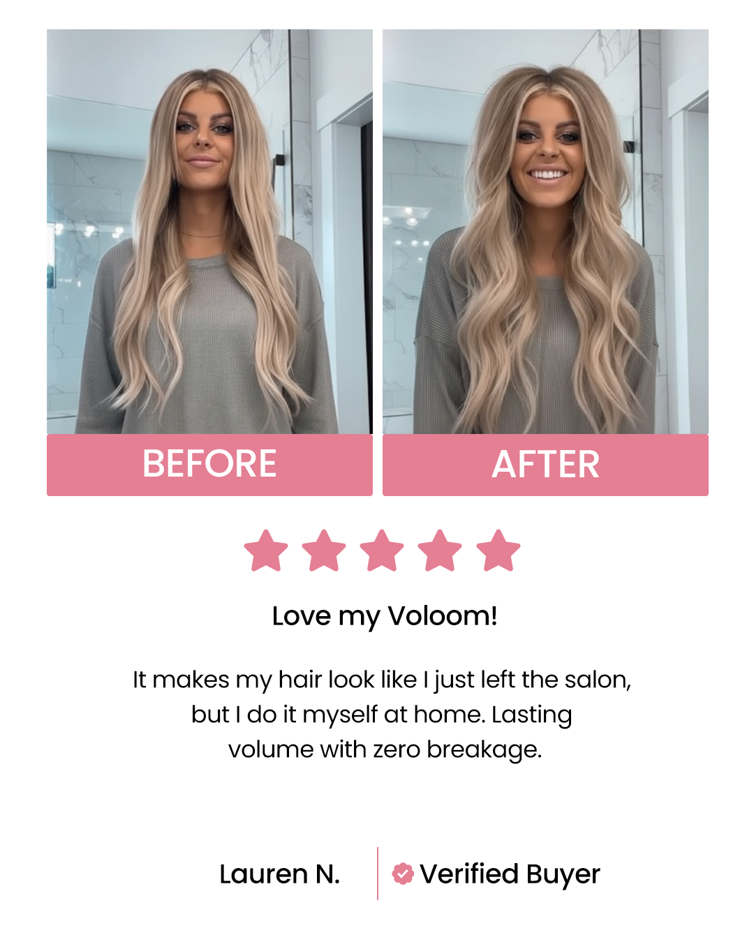 With VOLOOM 2.0, we’ve made it even easier to achieve luxurious volume by adding 50% more volumizing platforms.  You’ll have effortless, better-than-a-blow-out volume that will stay bouncy, and voluminous until your next shampoo.  And you’ll find that you need to shampoo and heat-style your hair far less often with VOLOOM because your hair never goes flat.  That not only saves you time but means your hair will get healthier over time with less damaging washing, blow-drying, and heat styling. It’s a win-win.
